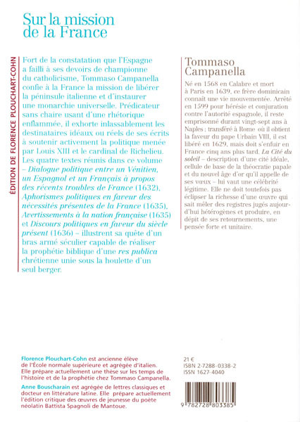 Fort de la constatation que l’Espagne a failli à ses devoirs de championne du catholicisme, Tommaso Campanella en vient à confier à la France la mission de libérer la péninsule italienne et d’instaurer une monarchie universelle. Prédicateur sans chaire usant d’une rhétorique enflammée, il exhorte inlassablement les destinataires idéaux ou réels de ses écrits à soutenir activement la politique menée par Louis XIII et le cardinal de Richelieu. Les quatre textes réunis dans ce volume : Dialogue politique entre un Vénitien, un Espagnol et un Français à propos des récents troubles de France (1632), Aphorismes politiques en faveur des nécessités présentes de la France (1635), Avertissements à la nation française (1635) et Discours politiques en faveur du siècle présent (1636), illustrent sa quête d’un bras armé séculier capable de réaliser la prophétie biblique d’une res publica chrétienne unie sous la houlette d’un seul berger.