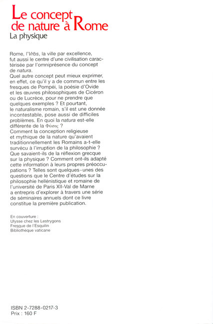 Comment la conception religieuse et mythique de la nature qu’avaient traditionnellement les Romains a-t-elle survécu à l’irruption de la philosophie ? Que savaient-ils de la réflexion grecque sur la physique ? Comment ont-ils adapté cette information à leurs propres préoccupations ? Telles sont quelques-unes des questions que le Centre d’études sur la philosophie hellénistique et romaine de l’université Paris XII-Val de Marne à entrepris d’explorer à travers une série de séminaires annuels dont ce livre constitue la première publication.