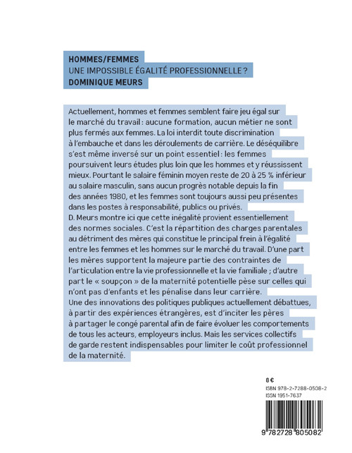 Cet opuscule commence par retracer les progrès accomplis en matière d’égalité hommes/femmes dans les dernières décennies. Pourtant, alors que désormais les femmes sont plus éduquées que les hommes, les inégalités professionnelles demeurent marquées. L’analyse de leurs déterminants et des politiques publiques – notamment des expériences étrangères – montre que pour résorber des inégalités de salaire persistantes, il faudra mettre en place des politiques de longue haleine. Elles seules pourront avoir des effets durables, en affectant les comportements individuels et les normes sociales.