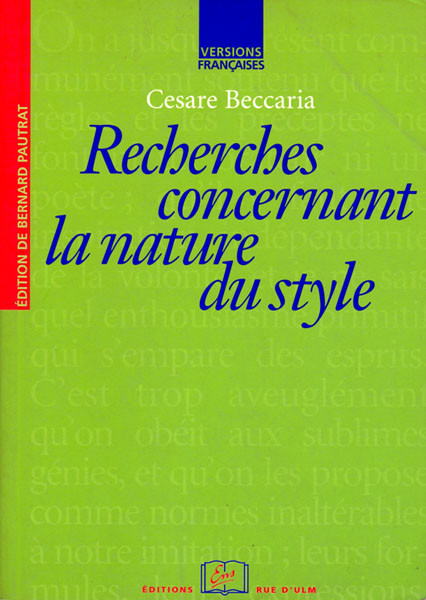 Ce volume propose à la lecture, dans une nouvelle traduction, les Recherches concernant la nature du style, où Beccaria entreprend de trouver scientifiquement la formule du bonheur de l’expression et de la communication réussie. On y a joint, en annexe, quelques brefs textes économiques inédits. On espère faire ainsi constater la grande unité de cette œuvre méconnue, et rendre à Beccaria sa pleine stature de philosophe des Lumières et d’ami de l’humanité.