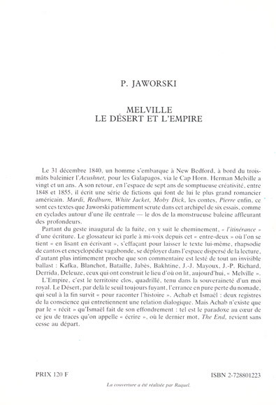 L’Empire, c’est le territoire clos, quadrillé, tenu dans la souveraineté d’un moi royal. Le Désert, par delà le seuil toujours fuyant, l’errance en pure perte du nomade, qui seul à la fin survit « pour raconter l’histoire ». Achab et Ismaël : deux registres de la conscience qui entretiennent une relation dialogique. Mais Achab n’existe que par le « récit » qu’Ismaël fait de son effondrement : tel est le paradoxe au cœur de ce jeu de traces qu’on appelle « écrire », où le dernier mot, The End, revient sans cesse au départ.