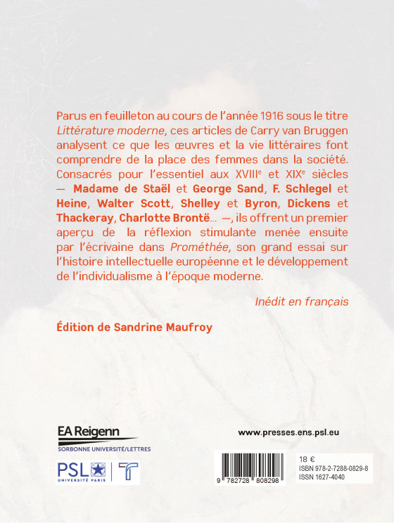 Parus en feuilleton au cours de l’année 1916 sous le titre Littérature moderne, ces articles analysent ce que les œuvres et la vie littéraires font comprendre de la place des femmes dans la société. Consacrés pour l’essentiel aux XVIIIe et XIXe siècles – Madame de Staël et George Sand, F. Schlegel et Heine, Walter Scott, Shelley et Byron, Dickens et Thackeray, Charlotte Brontë... –, ils offrent un premier aperçu de la réflexion stimulante conduite ensuite par l’écrivaine dans Prométhée, son grand essai sur l’histoire intellectuelle européenne et l'essor de l’individualisme à l’époque moderne.