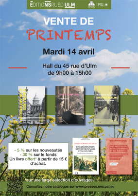 Vente de printemps des éditions Rue d’UlmVenez découvrir nos dernières nouveautés et vous procurer des livres de notre fonds à des conditions spécialement intéressantes. |
