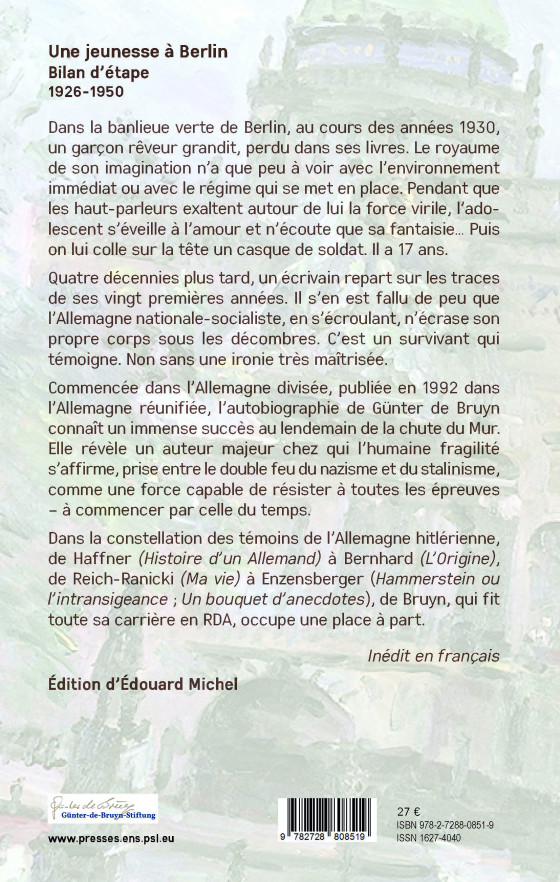 Dans la constellation des témoins de l’Allemagne hitlérienne, de S. Haffner (Histoire d’un Allemand, Actes Sud, 2003) à T. Bernhard (L’Origine, Gallimard, 2007), de M. Reich-Ranicki (Ma vie, Grasset, 2001) à H.-M. Enzensberger (Hammerstein ou l’intransigeance ; Un bouquet d’anecdotes – Gallimard, 2008 et 2022), de Bruyn, qui fit toute sa carrière en RDA, occupe une place à part.